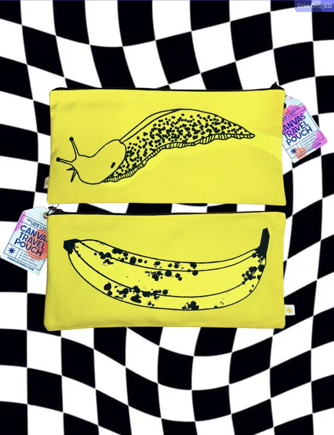 Shop › Banana Slug Travel Pouch Image 1 of 1 Banana Slug Travel Pouch $25.00 A canvas travel pouch with a Banana and Banana Slug printed on each side! Add To Cart Added! A canvas travel pouch with a Banana and Banana Slug printed on each side!