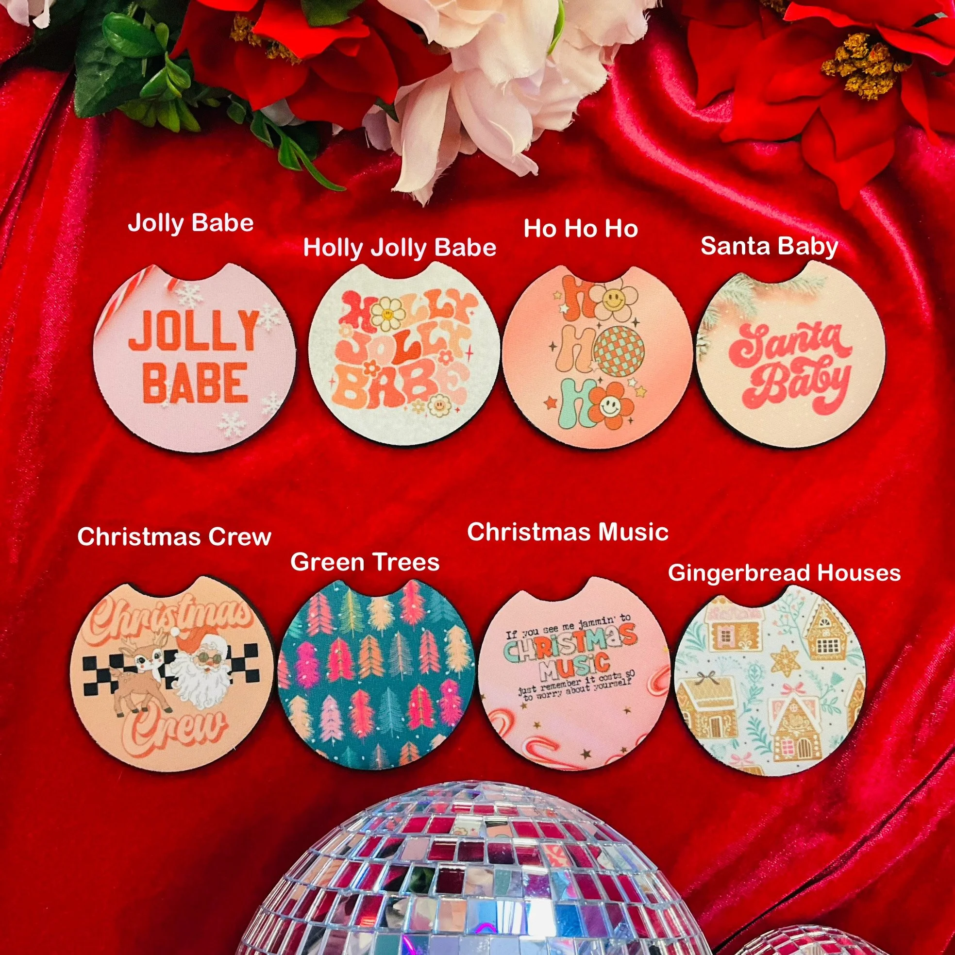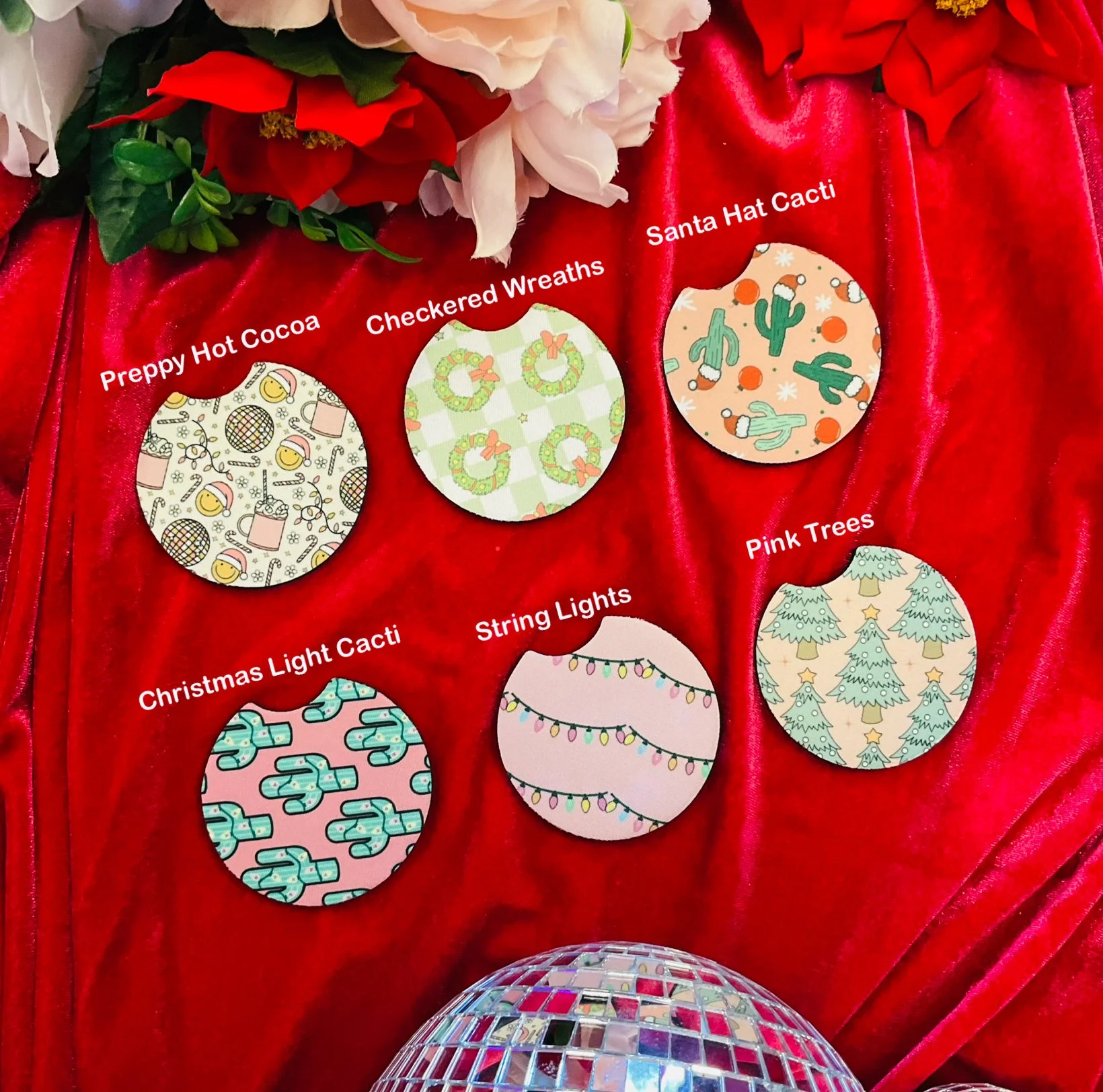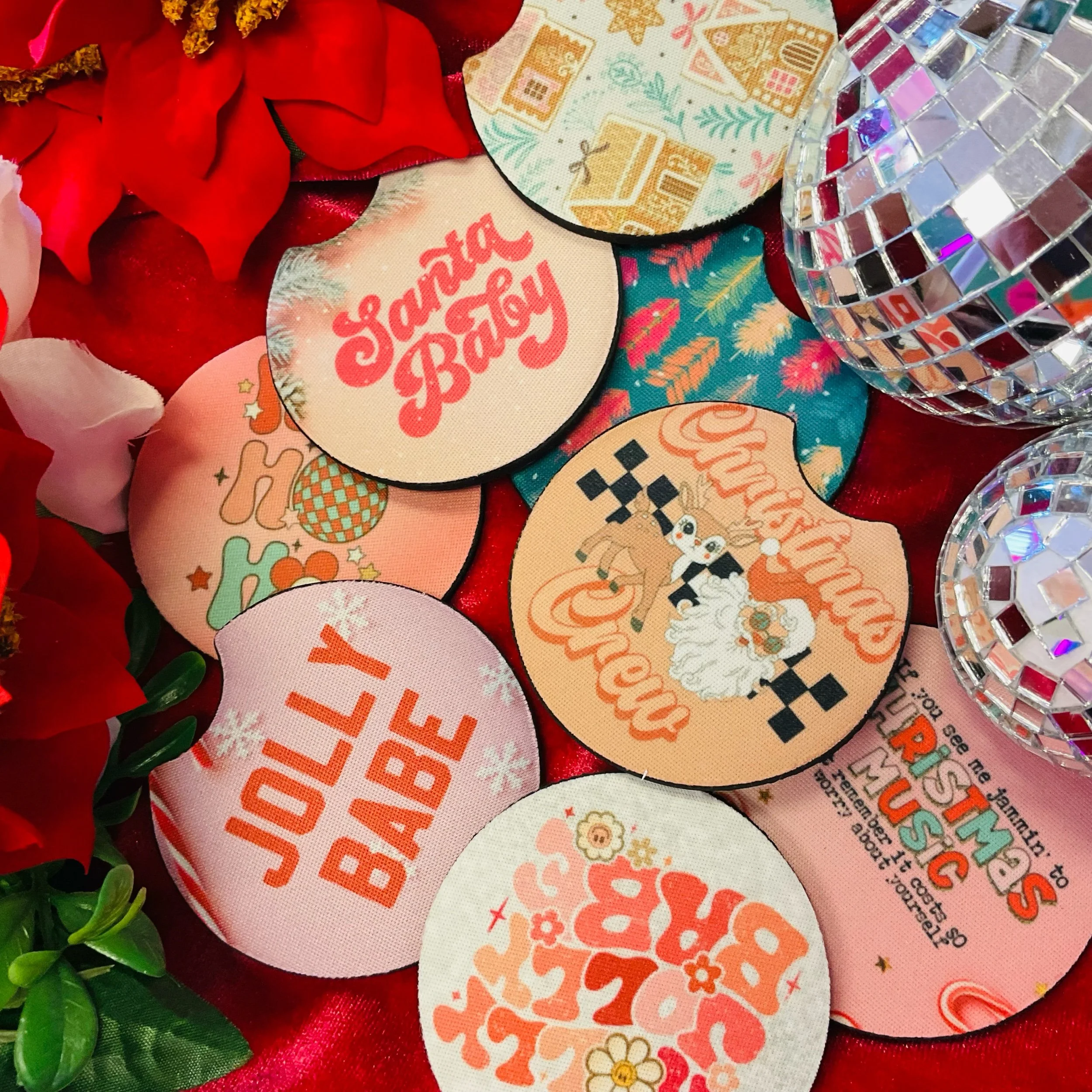 Shop › Christmas Car Coasters Image 1 of 3 Image 2 of 3 Image 3 of 3 Christmas Car Coasters $10.00 Keep your cup holders clean and festive with these coasters! Pattern: Santa Hat Cacti Christmas Light Cacti String Lights Pink trees Checkered Wreaths Christmas Crew Christmas Music Jolly Babe Santa Baby Ho Ho Ho Green Trees Quantity: Add To Cart Added! Keep your cup holders clean and festive with these coasters!