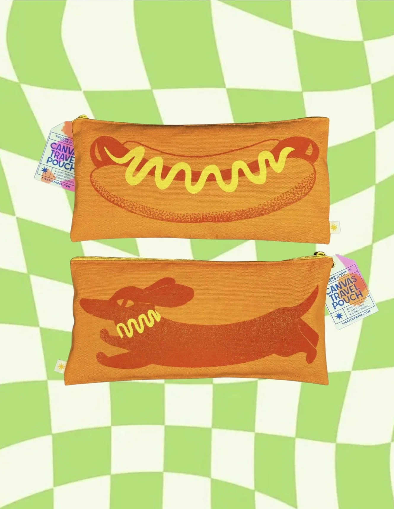 Shop › Hot Dog Travel Pouch Image 1 of 1 Hot Dog Travel Pouch $25.00 This adorable canvas travel bag has an image of a hot dog and sausage dog printed on each side! Add To Cart Added! This adorable canvas travel bag has an image of a hot dog and sausage dog printed on each side!